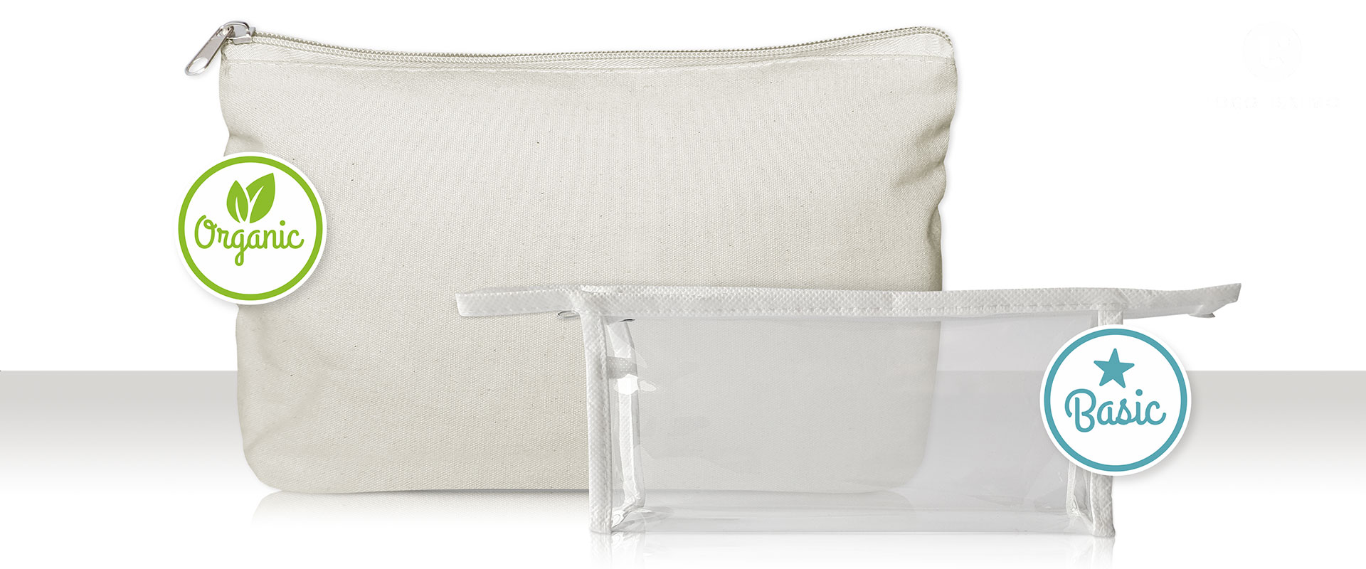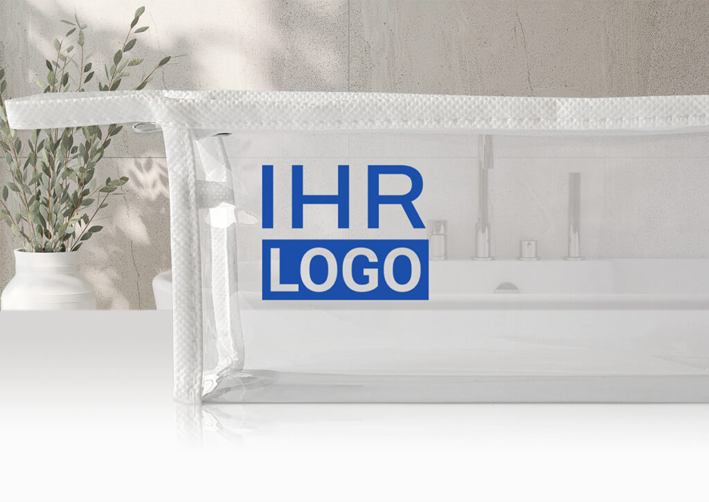 Kompakte und transparente Kosmetiktasche mit Gleitverschluss. Personalisierbar mit Ihrem Logo!