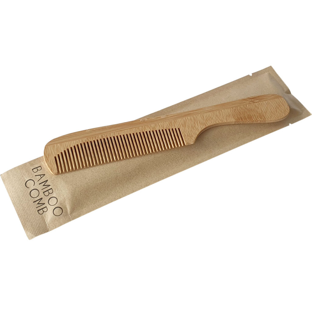 Der große Kamm besteht aus nachwachsendem Bambus-Holz, hat eine Länge von 18,5 cm und ist einzeln verpackt in einem recycelbaren Papierbeutel.