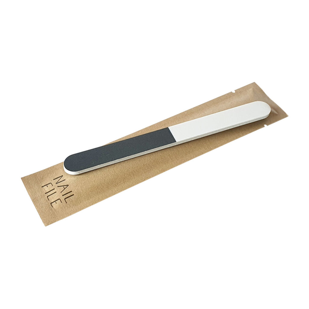 Soft Touch Nagelfeile mit gepolstertem Schaumstoffkern in 18,5 cm Länge, einzeln und hygienisch verpackt in einem recycelbaren Papierbeutel.